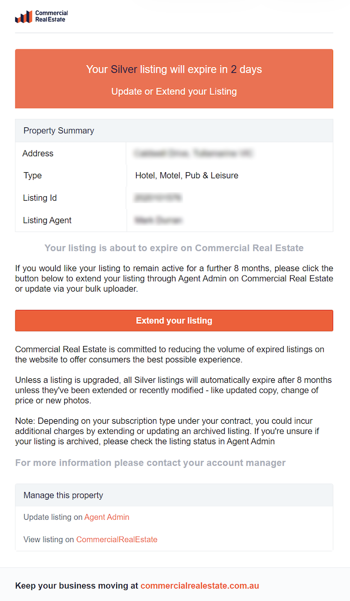 The primary agent on the listing and the agency’s general email address will receive notification emails before a listing is archived: